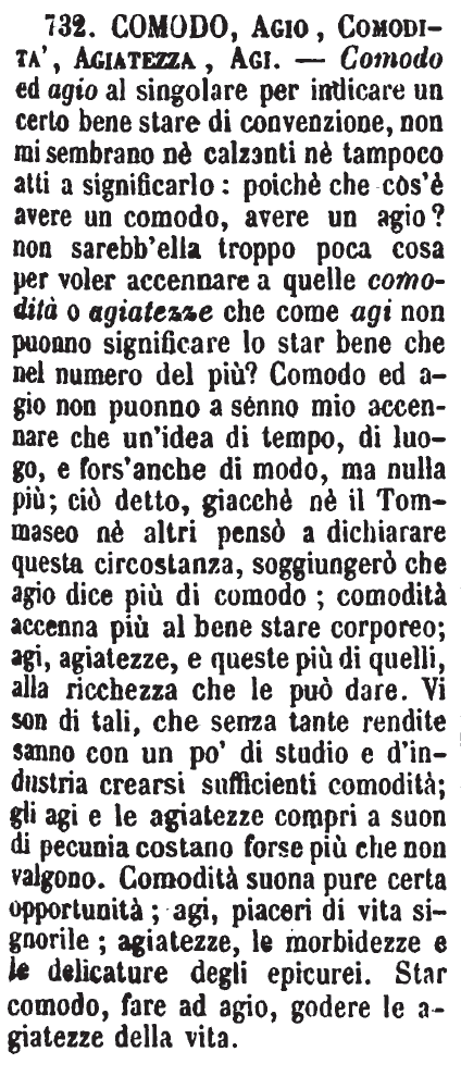 | Comodo, Agio, Comodità, Agiatezza, Agi - Comodo ed agio al singolare per indicare un certo bene stare di convenzione, non mi sembrano nè calzanti nè tampoco atti a significarlo: poichè che cos'è avere un comodo, avere un agio? non sarebb'ella troppo poca cosa per voler accennare a quelle comodità o agiatezze che come agi non puonno significare lo star bene che nel numero del più? Comodo ed agio non puonno a sénno mio accennare che un'idea di tempo, di luogo, e fors'anche di modo, ma nulla più; ciò detto, giacchè nè il Tommaseo nè altri pensò a dichiarare questa circostanza, soggiungerò che agio dice più di comodo; comodità accenna più al bene stare corporeo; agi, agiatezze, e queste più di quelli, alla ricchezza che le può dare. Vi son di tali, che senza tante rendite sanno con un pò di studio e d'industria crearsi sufficienti comodità; gli agi e le agiatezze compri a suon di pecunia costano forse più che non valgono. Comodità suona pure certa opportunità; agi, piaceri di vita signorile; agiatezze, le morbidezze e le delicature degli epicurei. Star comodo, fare ad agio, godere le agiatezze della vita. [immagine] |