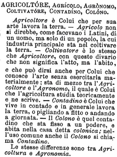 | Agricoltore, Agricolo, Agronomo, Coltivatore, Contadino, Colono - Agricoltore è Colui che per sua arte lavora la terra. - Agricolo non si direbbe, come facevano i Latini, di un uomo, ma solo di un popolo, la cui industria principale sta nel coltivare la terra. - Coltivatore è lo stesso che Agricoltore, con questo divario che non significa l'atto, ma l'abito, e che può dirsi anche per Colui che conosce l'arte senza esercitarla materialmente; sta di mezzo tra l'Agricoltore e l'Agronomo, il quale è Colui che l'agricoltura studia teoricamente e ne scrive. - Contadino è Colui che vive in contado e in generale lavora la terra, o pigliando a fitto o andando a giornata. - Il Colono è quel contadino che sta fisso a un podere, e abita nella casa detta colonica; nell'uso comune anche il Colono si chiama Contadino.