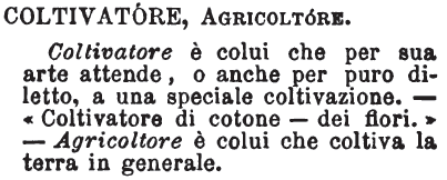 | Coltivatore, Agricoltore - Coltivatore è colui che per sua arte attende, o anche per puro diletto, ad una speciale coltivazione. - « Coltivatore di cotone - dei fiori.» - Agricoltore è colui che coltiva la terra in generale. [immagine] |