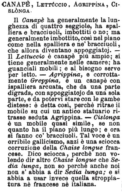 | Canapè, Lettuccio, Agrippina, Cislonga - Il Canapè ha generalmente la lunghezza di quattro seggiole, ha spalliera e bracciuoli, imbottiti o no; ma generalmente imbottito, così nel piano come nella spalliera e ne' bracciuoli, che allora diventano appoggiatoj. - Il Lettuccio è canapè più ampio; si tiene generalmente nelle camere; ha guanciali mobili; e al bisogno serve per letto. - Agrippina, e corrottamente Greppina, è un canapè con ispalliera arcuata, che da una parte digrada, con appoggiatojo da una sola parte, e da potervi stare con le gambe distese: è detta così, perchè ritrae il mobile su cui un antico statuario ritrasse seduta Agrippina. - Cislonga è un mobile quasi simile, se non quanto ha il piano più lungo; e ora si fanno co' bracciuoli. Tal voce è un orribile gallicismo, anzi è una sciocca corruzione della Chaise longue francese. Dico sciocca, perchè non volendo dir altro Chaise longue che Sedia lunga, non so perchè anche noi non s'abbia a dir Sedia lunga; e si abbia a usar invece quella stroppiatura nè francese nè italiana. [immagine] |