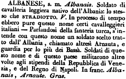 | Albanese - s. m. Albanais. Soldato di cavalleria leggiera nativo dell'Albania: lo stesso che stradiotto. V. In processo di tempo ebbero pure questo nome certi cavalleggieri italiani - Parlandosi della fanteria turca, s'intende con questo nome un soldato scelto tratto dall'Albania, chiamato altresì Arnauta, e guardia per lo più dei Bassà. Soldati di questo nome e di questo paese militarono altre volte agli stipendi della Repubblica di Venezia, e del Regno di Napoli. In franc. Albanais, Arnaute. Gras. [immagine] |
