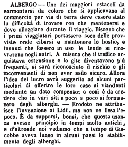 | Albergo - Uno dei maggiori ostacoli da sormontarsi da coloro che si applicavano al commercio per via di terra deve essere stato la difficoltà di trovare con che mantenersi e dove alloggiare durante il viaggio. Bisognò che i primi viaggiatori portassero seco delle provviste onde cibarsi e mantenere le bestie, e innanzi che fossero in uso le tende si ricovrarono negli antri. A misura che il traffico acquistava estensione e le gite diventavano più frequenti, si sarà riconosciuto il rischio e gli inconvenienti di non aver asilo sicuro. Allora l'idea del lucro avrà suggerito ad alcuni particolari di offerire le loro case ai viandanti mediante un dato compenso; e così è da credere che in vari siti a poco a poco si formassero degli alberghi. - Erodoto ne attribuisce l'invenzione ai Lidii, ma non ne fissa l'epoca. E' da supporsi, bensi, che questa usanza avesse principio in tempi molto antichi, e d'altronde noi vediamo che a tempo di Giacobbe aveva luogo in alcuni paesi lo stabilimento degli alberghi. [immagine] |