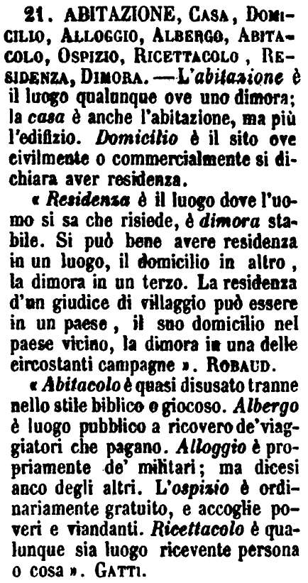 « Residenza è il luogo dove l'uomo si sa che risiede, è dimora stabile. Si può bene avere residenza in un luogo, il domicilio in altro, la dimora in un terzo. La residenza d'un giudice di villaggio può essere in un paese, il suo domicilio nel paese vicino, la dimora in una delle circostanti campagne ». Robaud. « Abitacolo è quasi disusato tranne nello stile biblico o giocoso. Albergo è luogo pubblico a ricovero de' viaggiatori che pagano. Alloggio è propriamente de' militari; ma dicesi anco degli altri. L'ospizio è ordinariamente gratuito, e accoglie poveri e viandanti. Ricettacolo è qualunque sia luogo ricevente persona o cosa ». Gatti. [immagine] |