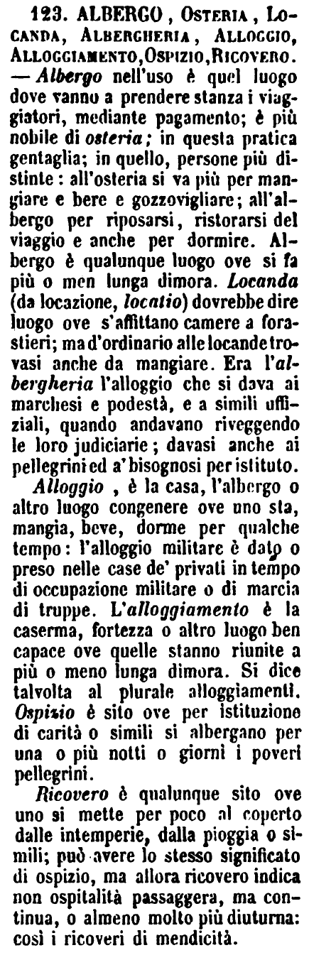 | Albergo, Osteria, Locanda, Albergheria, Alloggio, Alloggiamento, Ospizio, Ricovero - Albergo nell'uso è quel luogo dove vanno a prendere stanza i viaggiatori, mediante pagamento; è più nobile di osteria; in questa pratica gentaglia; in quello, persone più distinte: all'osteria si va più per mangiare e bere e gozzovigliare; all'albergo per riposarsi, ristorarsi del viaggio e anche per dormire. Albergo è qualunque luogo ove si fa più o men lunga dimora. Locanda (da locazione, locatio) dovrebbe dire luogo ove s'affittano camere a forastieri; ma d'ordinario alle locande trovasi anche da mangiare. Era l'albergheria l'alloggio che si dava ai marchesi e podestà, e a simili uffiziali, quando andavano riveggendo le loro judiciarie; davasi anche ai pellegrini ed a' bisognosi per istituto.