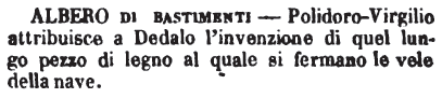| Albero di bastimenti - Polidoro-Virgilio attribuisce a Dedalo l'invenzione di quel lungo pezzo di legno al quale si fermano le vele della nave. [immagine] |