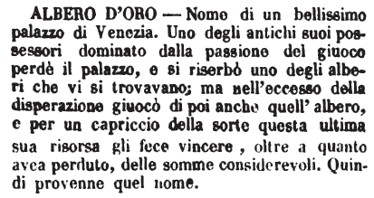 | Albero d’oro - Nome di un bellissimo palazzo di Venezia. Uno degli antichi suoi possessori dominato dalla passione del giuoco perdè il palazzo, e si riserbò uno degli alberi che vi si trovavano; ma nell'eccesso della disperazione giuocò di poi anche quell'albero, e per capriccio della sorte questa ultima sua risorsa gli fece vincere, oltre a quanto avea perduto, delle somme considerevoli. Quindi provenne quel nome. [immagine] |