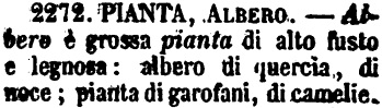 | Pianta, Albero - Pianta è qualunque vegetale che abbia fronde, fiori e frutti. Una pianta di basilico, una pianta di gelsomini, una pianta di limone. - Dicendo Albero s'intende sempre quello che ha fusto alto e grosso con molti rami. [immagine] |