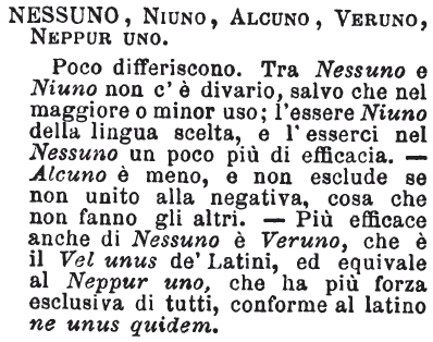 | Nessuno, Niuno, Alcuno, Veruno, Neppur uno - Poco differiscono. Tra Nessuno e Niuno non c'è divario, salvo che nel maggiore o minor uso; l'essere Niuno della lingua scelta, e l'esserci nel Nessuno un poco più di efficacia. - Alcuno è meno, e non esclude se non unito alla negativa, cosa che non fanno gli altri. - Più efficace anche di Nessuno è Veruno, che è il Vel unus de' Latini, ed equivale al Neppur uno, che ha più forza esclusiva di tutti, conforme al latino ne unus quidem. [immagine] |