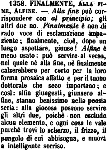 | Finalmente, Alla fine, Alfine - Alla fine può corrispondere con al principio; gli altri due no. Finalmente è non di rado voce di esclamazione impaziente; finalmente, cioè, dopo un lungo aspettare, giunse! Alfine è meno usato: può servire al verso, nel quale nè alla fine, nè finalmente calzerebbero per certo per la loro forma prosaica affatto e per il tuono dottorale che seco importano; e così: alfin giungesti, giunsero alfine, stanno benissimo nella poesia seria: alla giocosa possono servire gli altri due, poichè non esclude alcun elemento, e ogni cosa le vale purchè trovi lo scherzo, il frizzo, il pungolo di cui abbisogna, e muova a intelligente sorriso. [immagine] |