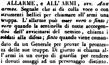 | Allarme, e All'armi - avv. Aux armes. Segnale che si dà colla voce o con strumenti bellici per chiamare all'armi una truppa. L'allarme può esser vero o finto; vero quando la sentinella di notte accorgendosi dell'avvicinarsi del nemico, chiama i soldati alla difesa; finto quando viene comandato da un Generale per provar la prontezza delle sue truppe. Di giorno si chiama all'armi in un corpo di guardia per rendere i dovuti omaggi ad un personaggio distinto. [immagine] |