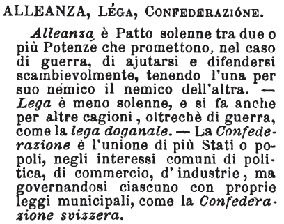 | Alleanza, Lega, Confederazione - Alleanza è Patto solenne tra due o più Potenze che promettono, nel caso di guerra, di ajutarsi e difendersi scambievolmente, tenendo l'una per suo nemico il nemico dell'altra. - Lega è meno solenne, e si fa anche per altre cagioni, oltrechè di guerra, come la lega doganale. - La Confederazione è l'unione di più Stati o popoli, negli interessi comuni di politica, di commercio, d'industrie, ma governandosi ciascuno con proprie leggi municipali, come la Confederazione svizzera. [immagine] |