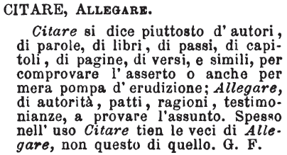 | Citare, Allegare - Citare si dice piuttosto d'autori, di parole, di libri, di passi, di capitoli, di pagine, di versi, e simili, per comprovare l'asserto o anche per mera pompa d'erudizione; Allegare, di autorità, patti, ragioni, testimonianze, a provare l'assunto. Spesso nell'uso Citare tien le veci di Allegare, non questo di quello. G.F. [immagine] |