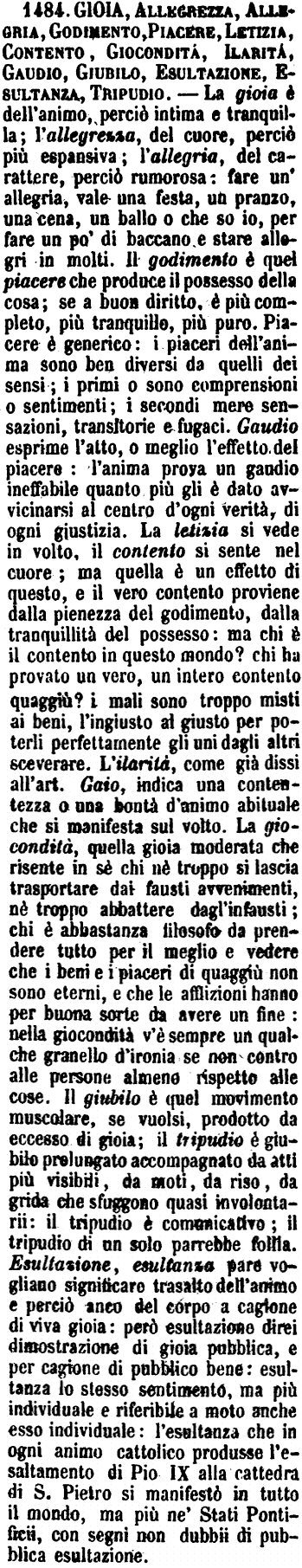 | Gioia, Allegrezza, Allegria, Godimento, Piacere, Letizia, Contento, Giocondità, Ilarità, Gaudio, Giubilo, Esultazione, Esultanza, Tripudio - La gioia è dell'animo, perciò intima e tranquilla; l'allegrezza, del cuore, perciò più espansiva; l'allegria, del carattere, perciò rumorosa: fare un'allegria, vale una festa, un pranzo, una cena, un ballo o che so io, per fare un po' di baccano e stare allegri in molti. Il godimento è quel piacere che produce il possesso della cosa; se a buon diritto, è più completo, più tranquillo, più puro. Piacere è generico: i piaceri dell'anima sono ben diversi da quelli dei sensi; i primi o sono comprensioni o sentimenti; i secondi mere sensazioni, transitorie e fugaci. Gaudio esprime l'atto, o meglio l'effetto del piacere: l'anima prova un gaudio ineffabile quanto più gli è dato avvicinarsi al centro d'ogni verità, di ogni giustizia. La letizia si vede in volto, il contento si sente nel cuore; ma quella è un effetto di questo, e il vero contento proviene dalla pienezza del godimento, dalla tranquillità del possesso: ma chi è il contento in questo mondo? chi ha provato un vero, un intero contento quaggiù? i mali sono troppo misti ai beni, l'ingiusto al giusto per poterli perfettamente gli uni dagli altri sceverare. L'ilarità, come già dissi all'art. Gaio, indica una contentezza o una bontà d'animo abituale che si manifesta sul volto. La giocondità, quella gioia moderata che risente in sè chi nè troppo si lascia trasportare dai fausti avvenimenti, nè troppo abbattere dagl'infausti; chi è abbastanza filosofo da prendere tutto per il meglio e vedere che i beni e i piaceri di quaggiù non sono eterni, e che le afflizioni hanno per buona sorte da avere un fine: nella giocondità v'è sempre un qualche granello d'ironia se non contro alle persone almeno rispetto alle cose. Il giubilo è quel movimento muscolare, se vuolsi, prodotto da eccesso di gioia; il tripudio è giubilo prolungato accompagnato da atti più visibili, da moti, da riso, da grida che sfuggono quasi involontarii: il tripudio è comunicativo; il tripudio di un solo parrebbe follia. Esultazione, esultanza pare vogliano significare trasalto dell'animo e perciò anco del corpo a cagione di viva gioia: però esultazione direi dimostrazione di gioia pubblica, e per cagione di pubblico bene: esultanza lo stesso sentimento, ma più individuale e riferibile a moto anche esso individuale: l'esultanza che in ogni animo cattolico produsse l'esaltamento di Pio IX alla cattedra di S. Pietro si manifestò in tutto il mondo, ma più ne' Stati Pontificii, con segni non dubbii di pubblica esultazione. [immagine] |
