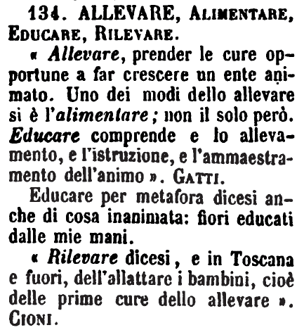 | Allevare, Alimentare, Educare, Rilevare - «Allevare, prender le cure opportune a far crescere un ente animato. Uno dei modi dello allevare si è l'alimentare; non il solo però. Educare comprende e lo allevamento, e l'istruzione, e l'ammaestramento dell'animo». Gatti.