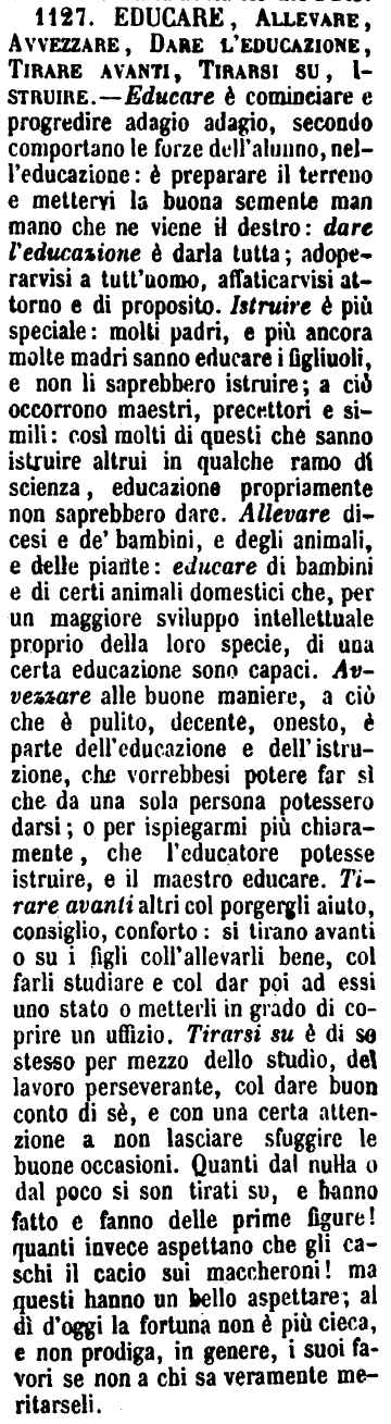 | Educare, Allevare, Avvezzare, Dare l’educazione, Tirare avanti, Tirarsi su, Istruire - Educare è cominciare e progredire adagio adagio, secondo comportano le forze dell'alunno, nell'educazione: è preparare il terreno e mettervi la buona semente man mano che ne viene il destro: dare l'educazione è darla tutta; adoperarvisi a tutt'uomo, affaticarvisi attorno e di proposito. Istruire è più speciale: molti padri, e più ancora molte madri sanno educare i figliuoli, e non li saprebbero istruire; a ciò occorrono maestri, precettori e simili: così molti di questi che sanno istruire altrui in qualche ramo di scienza, educazione propriamente non saprebbero dare. Allevare dicesi e de' bambini, e degli animali, e delle piante: educare di bambini e di certi animali domestici che, per un maggiore sviluppo intellettuale proprio della loro specie, di una certa educazione sono capaci. Avvezzare alle buone maniere, a ciò che è pulito, decente, onesto, è parte dell'educazione e dell'istruzione, che vorrebbesi potere far sì che da una sola persona potessero darsi; o per ispiegarmi più chiaramente, che l'educatore potesse istruire, e il maestro educare. Tirare avanti altri col porgergli aiuto, consiglio, conforto: si tirano avanti o su i figli coll'allevarli bene, col farli studiare e col dar poi ad essi uno stato o metterli in grado di coprire un uffizio. Tirarsi su è di se stesso per mezzo dello studio, del lavoro perseverante, col dare buon conto di sè, e con una certa attenzione a non lasciare sfuggire le buone occasioni. Quanti dal nulla o dal poco si son tirati su, e hanno fatto e fanno delle prime figure! quanti invece aspettano che gli caschi il cacio sui maccheroni! ma questi hanno un bello aspettare; al dì d'oggi la fortuna non è più cieca, e non prodiga, in genere, i suoi favori se non a chi sa veramente meritarseli. [immagine] |