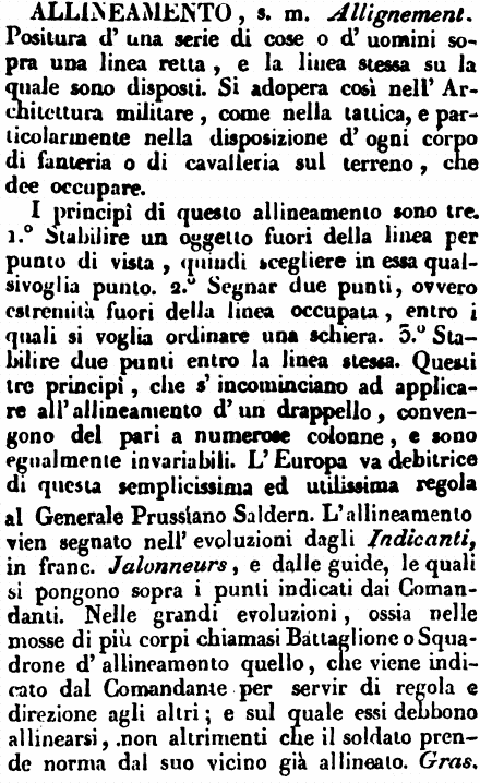 | Allineamento - s. m. Allignement. Positura d'una serie di cose o d'uomini sopra una linea retta, e la linea stessa su la quale sono disposti. Si adopera così nell'Architettura militare, come nella tattica, e particolarmente nella disposizione d'ogni corpo di fanteria o di cavalleria sul terreno, che dee occupare.