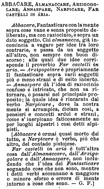 [Abbacare è ormai quasi morto del tutto e Narpicare è verbo, più che altro, del contado pistojese. Far castelli in aria è tutt'altra cosa dall'Almanaccare, dall'Arzigogolare e dall'Annaspare, non includendo che l'idea del Fantasticare sognando cose che non sono, mentre i detti verbi accennano a maggiore o minore sforzo e errore di mente intorno a cose che sono. - G. F.] [immagine] |