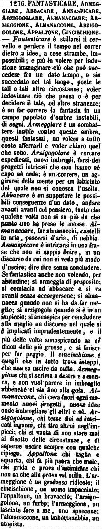 Fantasticare, Armeggiare, Abbacare, Annaspicare, Arzigogolare, Almanaccare; Armeggione, Almanaccone, Arzigogolone, Appaltone, Cincischione - Fantasticare è stillarsi il cervello e perdere il tempo nel correr dietro a idee, a cose strambe, impossibili; e più in volere per induzione immaginare ciò che può succedere fra un dato tempo, o sia succeduto nel tal luogo, poste le tali o tali altre circostanze; voler indovinare ciò che pensa o è per decidere il tale, od altre stranezze; è un far correre la fantasia in un campo popolato d'ombre instabili, di sogni. Armeggiare è un combattere inutile contro queste ombre, questi fantasmi, un volere a tutto costo afferrarli e veder chiaro quel che sono. Arzigogolare è cercare espedienti, nuovi imbrogli, farsi dei progetti intricati che non hanno nè capo nè coda; è un correre, un aggirarsi della mente per un labirinto del quale non si conosca l'uscita. Abbacare è un supputare le possibili conseguenze d'un dato, andare avanti avanti col pensiero, tanto che qualche volta non si sa più da che punto uno ha preso le mosse. Almanaccare, far almanacchi, castelli in aria, pascersi d'aria, di nebbia. Annaspicare è intricarsi in una frase che non si sappia finire, in un discorso da cui non si veda più modo di uscire; dire dire senza concludere. Si fantastica anche non volendo, per abitudine; si armeggia di proposito; si comincia ad abbacare e si va avanti senza accorgersene; si almanacca quando non si ha da far meglio; si arzigogola quando si è in un impiccio; si annaspica per concludere alla meglio un discorso nel quale si è implicati imprudentemente, e il più delle volte annaspicando se ne dicon delle più grosse, e si finisce per far peggio. Il cincischione è quegli che in tutto trova intoppi, che non sa uscire da nulla. Armeggione chi si scrima a destra e a manca, e non vuol parere in imbroglio abbenchè ci sia fino alla gola. Almanaccone, chi cava fuori ogni momento nuovi progetti, nuove idee onde imbrogliare gli altri e sè. Arzigogolone, chi tesse fini ed intricati inganni, chi tira altrui negl'impicci; chi si vanta di non stare mai al disotto delle circostanze, e di saperne uscire sempre con qualche ripiego. Appaltone chi taglia e squarta, chi fa più paura che male, chi grida e prova d'intimidire chi non sa che alla prova val nulla. L'armeggione è un gradasso ridicolo; il cincischione, un uomo impacciato; l'appaltone, un bravaccio; l'arzigogolone, un furbo; l'armeggione, un lasciate fare a me, uno spaccone; l'almanaccone, un imbottanebbia, un utopista. [immagine]
