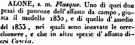 | Alone - s. m. Flasque. Uno di quei due pezzi di pancone dell'affusto da campo, giusta il modello 1830, e di quello d'assedio del 1833, nei quali sono incavate le orecchioniere, e che in altre specie d'affusto dicesi Coscia. [immagine] |