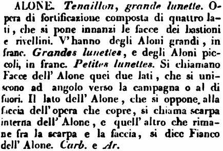 | Alone - Tenaillon, grande lunette. Opera di fortificazione composta di quattro lati, che si pone innanzi le facce dei bastioni e rivellini. V'hanno degli Aloni grandi, in franc. Grandes lunettes, e degli Aloni piccoli, in franc. Petites lunettes. Si chiamano Facce dell'Alone quei due lati, che si uniscono ad angolo verso la campagna o al di fuori. Il lato dell'Alone, che si oppone alla faccia dell'opera che copre, si chiama scarpa interna dell'Alone, e quell'altro che rimane fra la scarpa e la faccia, si dice Fianco dell'Alone. Carb. e Ar. [immagine] |