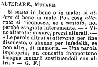 | Alterare, Mutare - Si muta in bene o in male; si altera di bene in male. Poi, cosa alterata si riconosce, se è mutata, no, perchè cangiata interamente. - «Vino alterato; misure, prezzi alterati.» - «Le parole altrui si alterano per fine disonesto, o almeno per infedeltà, se non altro, di memoria. - Una parola impropria, un concetto inopportuno bisogna mutarli sostituendoli con altri.» - G.F.] [immagine] |