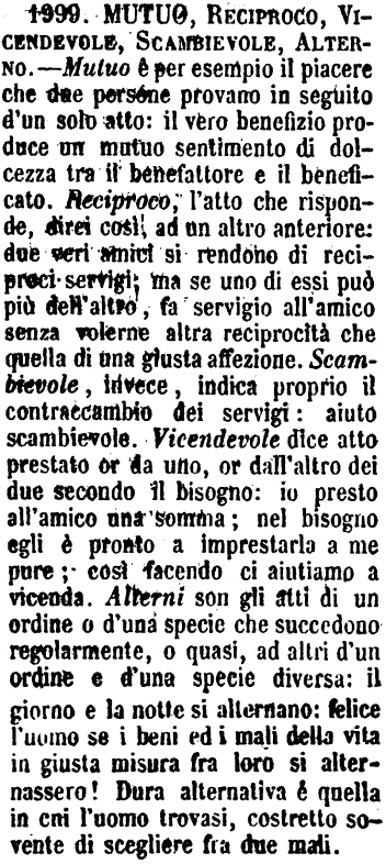 | Mutuo, Reciproco, Vicendevole, Scambievole, Alterno - Mutuo è per esempio il piacere che due persone provano in seguito d'un solo atto: il vero benefizio produce un mutuo sentimento di dolcezza tra il benefattore e il beneficato. Reciproco, l'atto che risponde, direi così, ad un altro anteriore: due veri amici si rendono di reciproci servigi; ma se uno di essi può più dell'altro, fa servigio all'amico senza volerne altra reciprocità che quella di una giusta affezione. Scambievole, invece, indica proprio il contraccambio dei servigi: aiuto scambievole. Vicendevole dice atto prestato or da uno, or dall'altro dei due secondo il bisogno: io presto all'amico una somma; nel bisogno egli è pronto a imprestarla a me pure; così facendo ci aiutiamo a vicenda. Alterni son gli atti di un ordine o d'una specie che succedono regolarmente, o quasi, ad altri d'un ordine e d'una specie diversa: il giorno e la notte di alternano: felice l'uomo se i beni ed i mali della vita in giusta misura fra loro si alternassero! Dura alternativa è quella in cui l'uomo trovasi, costretto sovente di scegliere fra due mali. [immagine] |