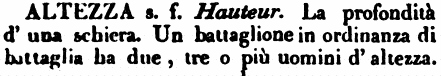 | Altezza - s. f. Hauteur. La profondità d'una schiera. Un battaglione in ordinanza di battaglia ha due, tre o più uomini d'altezza. [immagine] |