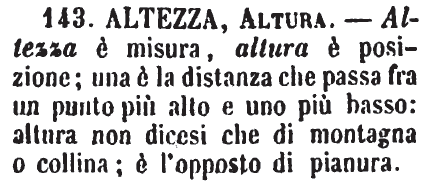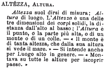 | Altezza, Altura - Altezza suol dirsi di misura; Altura di luogo. L'Altezza è una delle tre dimensioni dei corpi solidi, la distanza dall'alto al basso; L'Altura è il punto, o la parte più alta, o di un monte o di un colle. - «Il monte è di tanta altezza, che dalla sua altura si vede il mare.» - Si intende anche per Luogo alto in genere. - «Montava su tutte le alture per iscoprir paese.» [immagine] |