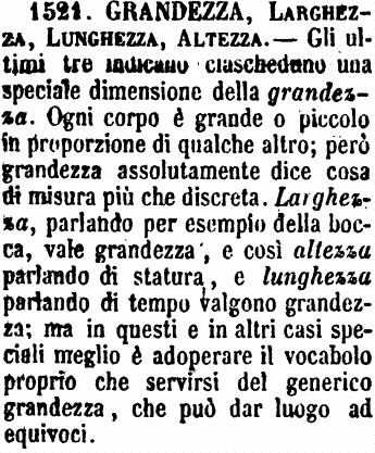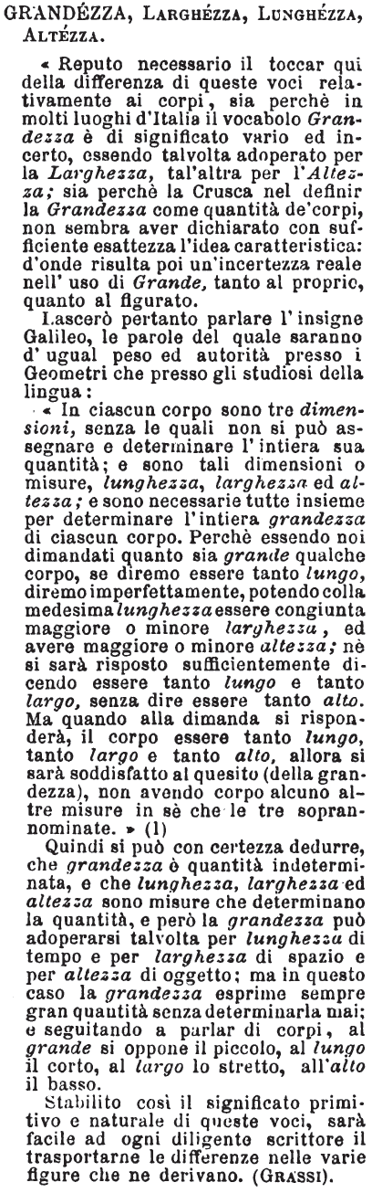 | Grandezza, Larghezza, Lunghezza, Altezza - «Reputo necessario il toccar qui della differenza di queste voci relativamente ai corpi, sia perchè in molti luoghi d'Italia il vocabolo Grandezza è di significato vario ed incerto, essendo talvolta adoperato per la Larghezza, tal'altra per l'Altezza; sia perchè la Crusca nel definir la Grandezza come quantità de' corpi, non sembra aver dichiarato con sufficiente esattezza l'idea caratteristica: d'onde risulta poi un'incertezza reale nell'uso di Grande, tanto al proprio, quanto al figurato.