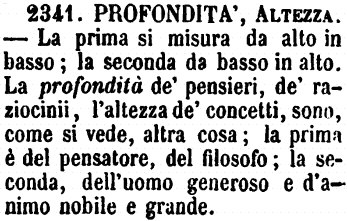 | Profondità, Altezza - La prima si misura da alto in basso; la seconda da basso in alto. La profondità de' pensieri, de' raziocinii, l'altezza de' concetti, sono, come si vede, altra cosa; la prima è del pensatore, del filosofo; la seconda, dell'uomo generoso e d'animo nobile e grande. [immagine] |