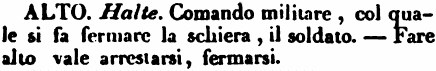 | Alto - Halte. Comando militare, col quale si fa fermare la schiera, il soldato. - Fare alto vale arrestarsi, fermarsi. [immagine] |