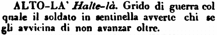 | Alto-là - Halte-là. Grido di guerra col quale il soldato in sentinella avverte chi se gli avvicina di non avanzar oltre. [immagine] |