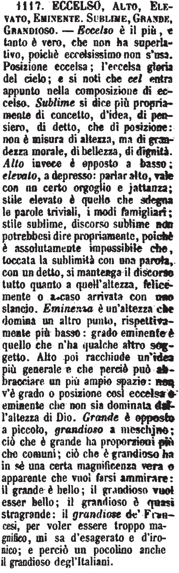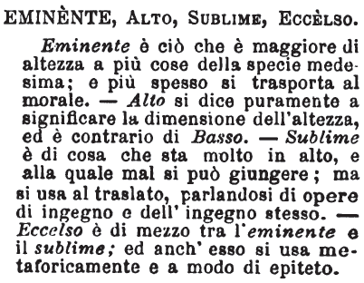 | Eminente, Alto, Sublime, Eccelso - Eminente è ciò che è maggiore di altezza a più cose della specie medesima; e più spesso si trasporta al morale. - Alto si dice puramente a significare la dimensione dell'altezza, ed è contratio di Basso. - Sublime è di cosa che sta molto in alto, e alla quale mal si può giungere; ma si usa al traslato, parlandosi di opere di ingegno e dell'ingegno stesso. - Eccelso è di mezzo tra l'eminente e il sublime; ed anch'esso si usa metaforicamente e a modo di epiteto. [immagine] |
