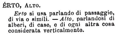 | Erto, Alto - Erto si usa parlando di passaggio, di via o simili. - Alto, parlandosi di alberi, di case, e di ogni altra cosa considerata verticalmente. [immagine] |