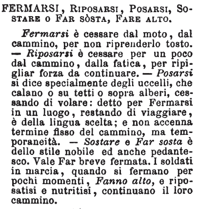 | Fermarsi, Riposarsi, Posarsi, Sostare o Far sosta, Fare alto - Fermarsi è cessare dal moto, dal cammino, per non riprenderlo tosto. - Riposarsi è cessare per un poco dal cammino, dalla fatica, per ripigliar forza da continuare. - Posarsi si dice specialmente degli uccelli, che calano o su tetti o sopra alberi, cessando di volare: detto per Fermarsi in un luogo, restando di viaggiare, è della lingua scelta; e non accenna termine fisso del cammino, ma temporaneità. - Sostare e Far sosta è dello stile nobile ed anche pedantesco. Vale Far breve fermata. I soldati in marcia, quando si fermano per pochi momenti, Fanno alto, e riposatisi e nutritisi, continuano il loro cammino. [immagine] |