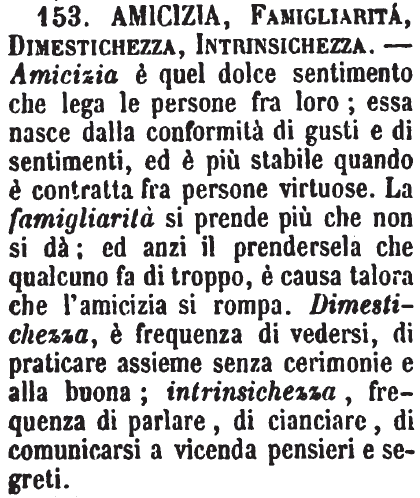 | Amicizia, Famigliarità, Dimestichezza, Intrinsichezza - Amicizia è quel dolce sentimento che lega le persone fra loro; essa nasce dalla conformità di gusti e di sentimenti, ed è più stabile quando è contratta fra persone virtuose. La famigliarità si prende più che non si dà; ed anzi il prendersela che qualcuno fa di troppo, è causa talora che l'amicizia si rompa. Dimestichezza, è frequenza di vedersi, di praticare assieme senza cerimonie e alla buona; intrinsichezza, frequenza di parlare, di cianciare, di comunicarsi a vicenda pensieri e segreti. [immagine] |