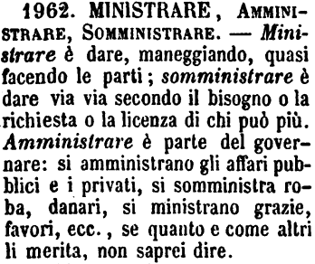 Ministrare, Amministrare, Somministrare - Ministrare è dare, maneggiando, quasi facendo le parti; somministrare è dare via via secondo il bisogno o la richiesta o la licenza di chi può più. Amministrare è parte del governare: si amministrano gli affari pubblici e i privati, si somministra roba, danari, si ministrano grazie, favori, ecc., se quanto e come altri li merita, non saprei dire. [immagine]