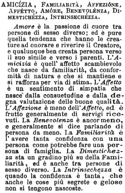 | Amicizia, Familiarità, Affezione, Affetto, Amore, Benevolenza, Dimestichezza, Intrinsechezza - Amore è la passione di cuore tra persone di sesso diverso; ed è pure quella tendenza che hanno le creature ad onorare e riverire il Creatore, e qualunque ben creata persona verso il suo simile e verso i parenti. L'Amicizia è quell'affetto scambievole che nasce da familiarità, da conformità di natura e che si mantiene e si rafforza per via di stima. L'Affetto è un sentimento di simpatia che nasce dalla consuetudine e dalla degna valutazione delle buone qualità. L'Affezione è meno dell'Affetto, ed è frutto generalmente di servigi ricevuti. La Benevolenza è ancor meno, e generalmente si dice parlando di persona da meno. La Familiarità è l'avere tanta confidenza con una persona come potrebbe fare una persona di famiglia. La Dimestichezza sta un gradino più su della Familiarità, ed è anche tra persone di sesso diverso. La Intrinsechezza è quando la confidenza è tanta, che anche le cose più segrete e gelose non si tengono nascoste. [immagine] |