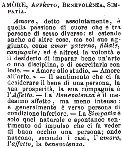 | Amore, Affetto, Benevolenza, Simpatia - Amore, detto assolutamente, è quella passione di cuore che è tra persone di sesso diverso: si estende anche ad altre cose, ma col suo aggiunto, come amor paterno, filiale, conjugale; ed è altresì la volontà e il desiderio di imparar bene un'arte o una disciplina, o di esercitarla con lode. - «Amore allo studio, - Amore all'arte.» - Il sentimento che ci fa desiderare il bene di una persona, la sua prosperità, la sua compagnia è l'Affetto. - La Benevolenza, è il medesimo affetto, ma meno intenso: e generalmente è verso persona di condizione inferiore. - La Simpatia è solo quel naturale e spontaneo sentimento od impulso che ci fa veder di buon occhio una persona; onde nascono, secondo i casi, l'amore, l'affetto, la benevolenza. [immagine] |