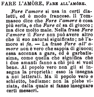 | Fare l’amore, Fare all’amore - Fare l'amore si usa in certi dialetti, ed è modo francese. Il Tommaseo dice che Fare l'amore è cosa più seria, e che Fare al sa di giuoco; ma dice molto male. Nella frase Fare l'amore il Fare non può avere altro che il suo natural significato; nè l'amore si fa. - La frase Fare all'amore non è vero che sappia di giuoco; essa accenna a gara, ed è garbatissima, come quella che significa che i due amanti fanno a chi più si vuol bene. Al popolo vero non gli si insegna la proprietà: esso la insegna a noi letterati. Ma il popolo vero e schietto, badiamo: non la plebe viziata, dalla quale si fanno insegnare certi messeri. [immagine] |