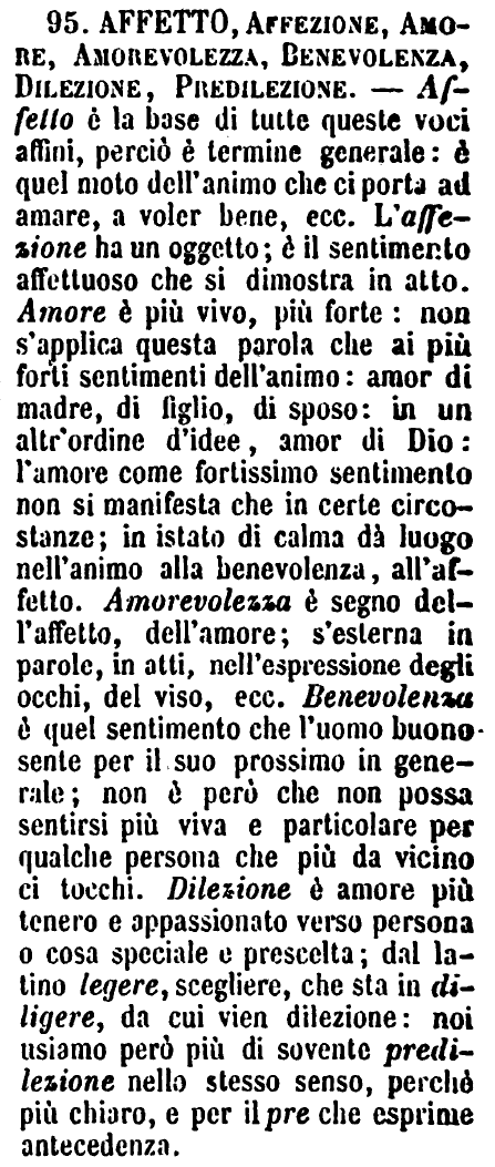 | Affetto, Affezione, Amore, Amorevolezza, Benevolenza, Dilezione, Predilezione - Affetto è la base di tutte queste voci affini, perciò è termine generale: è quel moto dell'animo che ci porta ad amare, a voler bene, ecc. L'affezione ha un oggetto; è il sentimento affettuoso che si dimostra in atto. Amore è più vivo, più forte: non s'applica questa parola che ai più forti sentimenti dell'animo: amor di madre, di figlio, di sposo: in un altr'ordine d'idee, amor di Dio: l'amore come fortissimo sentimento non si manifesta che in certe circostanze; in istato di calma dà luogo nell'animo alla benevolenza, all'affetto. Amorevolezza è segno dell'affetto, dell'amore; s'esterna in parole, in atti, nell'espressione degli occhi, del viso, ecc. Benevolenza è quel sentimento che l'uomo buono sente per il suo prossimo in generale; non è però che non possa sentirsi più viva e particolare per qualche persona che più da vicino ci tocchi. Dilezione è amore più tenero e appassionato verso persona o cosa speciale e prescelta; dal latino legere, scegliere, che sta in diligere, da cui vien dilezione: noi usiamo però più di sovente predilezione nello stesso senso, perchè più chiaro, e per il pre che esprime antecedenza. [immagine] |