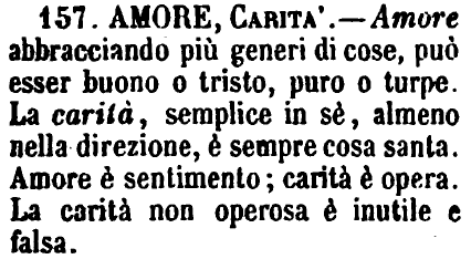 | Amore, Carità - Amore abbracciando più generi di cose, può esser buono o tristo, puro o turpe. La carità, semplice in sè, almeno nella direzione, è sempre cosa santa. Amore è sentimento; carità è opera. La carità non operosa è inutile e falsa. [immagine] |