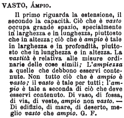 | Vasto, Ampio - Il primo riguarda la estensione, il secondo la capacità. Ciò che è vasto occupa grande spazio, specialmente in larghezza e in lunghezza, piuttosto che in altezza; ciò che è ampio è tale in larghezza e in profondità, piuttosto che in lunghezza e in altezza. La vastità è relativa alle misure ordinarie delle cose simili; L'ampiezza a quelle che debbono esservi contenute. Non tutto ciò che è ampio è vasto: il vasto è tale per tutti; l'ampio è tale a seconda di ciò che deve esservi contenuto. Di vaso, di fossa, di via, di veste, ampio non vasto. - Di edifizio, di mare, di deserto, meglio vasto che ampio. G. F. [immagine] |