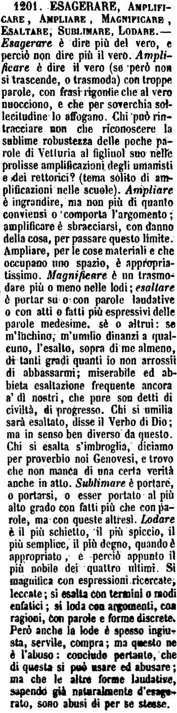 | Esagerare, Amplificare, Ampliare, Magnificare, Esaltare, Sublimare, Lodare - Esagerare è dire più del vero, e perciò non dire più il vero. Amplificare è dire il vero (se però non si trascende, o trasmoda) con troppe parole, con frasi rigonfie che al vero nuocciono, e che per soverchia sollecitudine lo affogano. Chi può rintracciare non che riconoscere la sublime robustezza delle poche parole di Vetturia al figliuol suo nelle prolisse amplificazioni degli umanisti e dei rettorici? (tema solito di amplificazioni nelle scuole). Ampliare è ingrandire, ma non più di quanto conviensi o comporta l'argomento; amplificare è sbracciarsi, con danno della cosa, per passare questo limite. Ampliare, per le cose materiali e che occupano uno spazio, è appropriatissimo. Magnificare è un trasmodare più o meno nelle lodi; esaltare è portar su o con parole laudative o con atti o fatti più espressivi delle parole medesime, sè o altrui: se m'inchino, m’umilio dinanzi a qualcuno, l’esalto, sopra di me almeno, di tanti gradi quanti io non arrossii di abbassarmi; miserabile ed abbieta esaltazione frequente ancora a’ dì nostri, che pure son detti di civiltà, di progresso. Chi si umilia sarà esaltato, disse il Verbo di Dio; ma in senso ben diverso da questo. Chi si esalta s'imbroglia, diciamo per proverbio noi Genovesi, e trovo che non manca di una certa verità anche in atto. Sublimare è portare, o portarsi, o esser portato al più alto grado con fatti più che con parole, ma con queste altresì. Lodare è il più schietto, il più spiccio, il più semplice, il più degno, quando è appropriato, e perciò appunto il più nobile dei quattro ultimi. Si magnifica con espressioni ricercate, leccate; si esalta con termini o modi enfatici; si loda con argomenti, con ragioni, con parole e forme discrete. Però anche la lode è spesso ingiusta, servile, compra; ma questo ne è l'abuso: concludo pertanto che di questa si può usare ed abusare; ma che le altre forme laudative, sapendo già naturalmente d'esagerato, sono abusi di per se stesse. [immagine] |