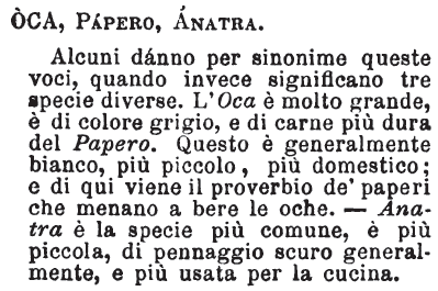 | Oca, Papero, Anatra - Alcuni dànno per sinonime queste voci, quando invece significano tre specie diverse. L'Oca è molto grande, è di colore grigio, e di carne più dura del Papero. Questo è generalmente bianco, più piccolo, più domestico; e di qui viene il proverbio de' paperi che menano a bere le oche. - Anatra è la specie più comune, è più piccola, di pennaggio scuro generalmente, e più usata per la cucina. [immagine] |