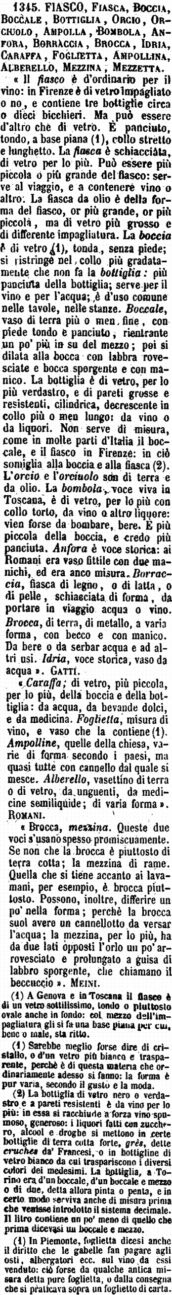 | Fiasco, Fiasca, Boccia, Boccale, Bottiglia, Orcio, Orciuolo, Ampolla, Bombola, Anfora, Borraccia, Brocca, Idria, Caraffa, Foglietta, Ampollina, Alberello, Mezzina, Mezzetta - «Il fiasco è d’ordinario per il vino: in Firenze è di vetro impagliato o no, e contiene tre bottiglie circa o dieci bicchieri. Ma può essere d’altro che di vetro. È panciuto, tondo, a base piana (1), collo stretto e lunghetto. La fiasca è schiacciata, di vetro per lo più. Può essere più piccola o più grande del fiasco: serve al viaggio, e a contenere vino o altro. La fiasca da olio è della forma del fiasco, or più grande, or più piccola, ma di vetro più grosso e di differente impagliatura. La boccia è di vetro (1), tonda, senza piede; si ristringe nel collo più gradatamente che non fa la bottiglia: più panciuta della bottiglia; serve per il vino e per l’acqua; è d’uso comune nelle tavole, nelle stanze. Boccale, vaso di terra più o men fine, con piede tondo e panciuto, rientrante un po’ più in su del mezzo; poi si dilata alla bocca con labbra rovesciate e bocca sporgente e con manico. La bottiglia è di vetro, per lo più verdastro, e di pareti grosse e resistenti, cilindrica, decrescente in collo più o men lungo: da vino o da liquori. Non serve di misura, come in molte parti d’Italia il boccale, e il fiasco in Firenze: in ciò somiglia alla boccia e alla fiasca (2). L’orcio e l’orciuolo son di terra e da olio. La bombola, voce viva in Toscana, è di vetro, per lo più con collo torto, da vino o altro liquore: vien forse da bombare, bere. È più piccola della boccia, e credo più panciuta. Anfora è voce storica: ai Romani era vaso fittile con due manichi, ed era anco misura. Borraccia, fiasca di legno, o di latta, o di pelle, schiacciata di forma, da portare in viaggio acqua o vino. Brocca, di terra, di metallo, a varia forma, con becco e con manico. Da bere o da serbar acqua e ad altri usi. Idria, voce storica, vaso da acqua». Gatti.
