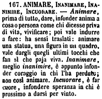 | Animare, Inanimare, Inanimire, Incuorare - Animare, prima di tutto, dare, infonder anima a cosa o persona come chi dicesse priva di vita, vivificare; poi vale indurre a fare: ha sensi traslati: animare una statua, una figura in un quadro, vale dargli quegli ultimi tocchi che fan sì che paja viva. Inanimare, meglio inanimire, è appunto infonder coraggio in chi l'ha perduto; non così animare. Incuorare, è far cuore, infondere speranza in chi è prossimo a darsi per vinto. [immagine] |