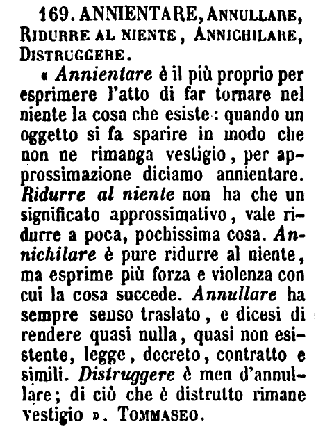 | Annientare, Annullare, Ridurre al niente, Annichilare, Distruggere - «Annientare è il più proprio per esprimere l'atto di far tornare nel niente la cosa che esiste: quando un oggetto si fa sparire in modo che non ne rimanga vestigio, per approssimazione diciamo annientare. Ridurre al niente non ha che un significato approssimativo, vale ridurre a poca, pochissima cosa. Annichilare è pure ridurre al niente, ma esprime più forza e violenza con cui la cosa succede. Annullare ha sempre senso traslato, e dicesi di rendere quasi nulla, quasi non esistente, legge, decreto, contratto e simili. Distruggere è men d'annullare; di ciò che è distrutto rimane vestigio». Tommaseo. [immagine] |