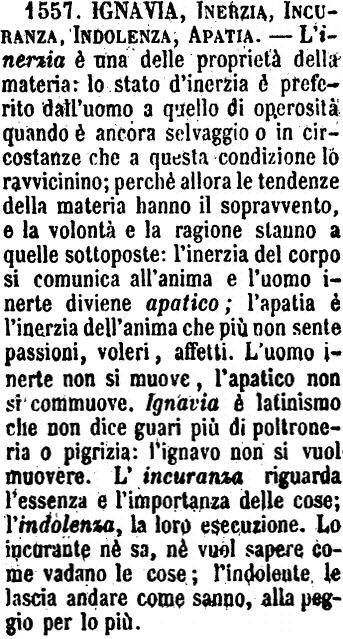 | Ignavia, Inerzia, Incuranza, Indolenza, Apatia - L'inerzia è una delle proprietà della materia: lo stato d'inerzia è preferito dall'uomo a quello di operosità quando è ancora selvaggio o in circostanze che a questa condizione lo ravvicinino; perchè allora le tendenze della materia hanno il sopravvento, e la volontà e la ragione stanno a quelle sottoposte: l'inerzia del corpo si comunica all'anima e l'uomo inerte diviene apatico; l'apatia è l'inerzia dell'anima che più non sente passioni, voleri, affetti. L'uomo inerte non si muove, l'apatico non si commuove. Ignavia è latinismo che non dice guari più di poltroneria o pigrizia: l'ignavo non si vuol muovere. L'incuranza riguarda l'essenza e l'importanza delle cose; l'indolenza, la loro esecuzione. Lo incurante nè sa, nè vuol sapere come vadano le cose; l'indolente le lascia andare come sanno, alla peggio per lo più. [immagine] |