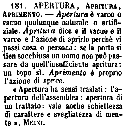 | Apertura, Apritura, Aprimento - Apertura è varco o vacuo qualunque naturale o artifiziale. Apritura dice e il vacuo e il varco e l'azione di aprirlo perchè vi passi cosa o persona: se la porta si tien socchiusa un uomo non può passare da quell'insufficiente apritura: un topo sì. Aprimento è proprio l'azione di aprire.